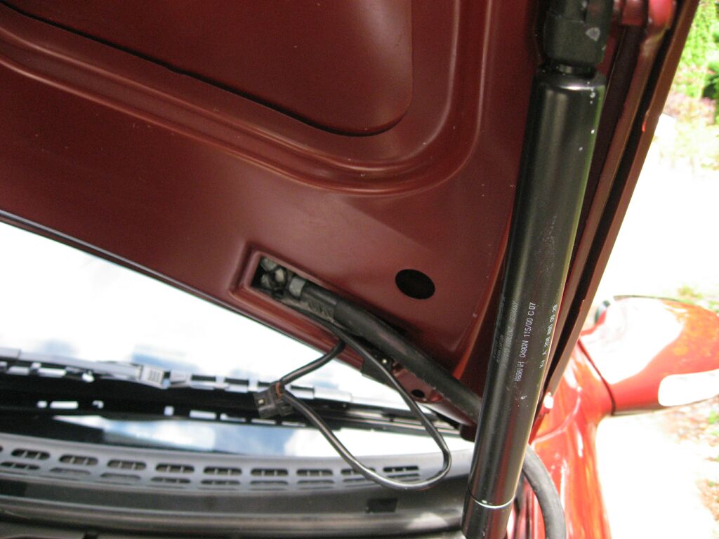 picture of the fluid hoses on the passenger side of the hood. The nozzles